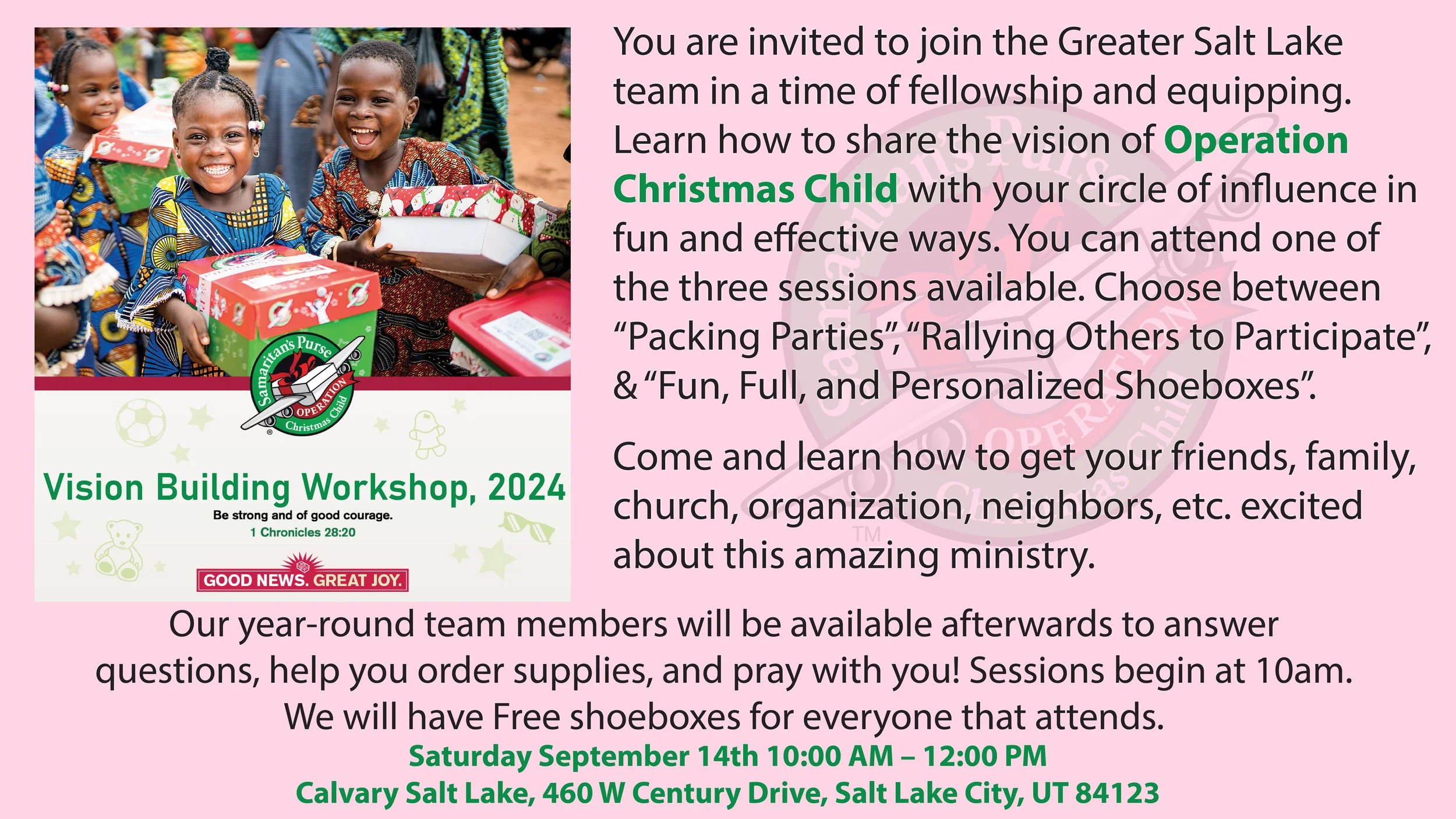 You are invited to join the Greater Salt Lake team in a time of fellowship and equipping. Learn ho to share the vision of Operation Christmas Child with your circle of influence in fun and effective ways. you can attend one of the three sessions available. Choose between “Packing Parties,” “Rallying Others to Participate,” & “Fun, Full, and Personalized Shoeboxes.”